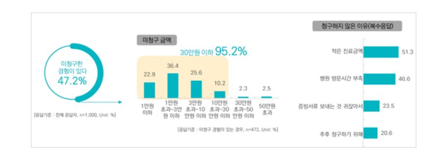 최근 2년 이내에 실손의료보험금을 청구할 수 있었음에도 청구를 포기한 경험은 전체 응답의 47.2%였다. 이들이 청구를 포기한 금액은 30만원 이하의 소액청구건이 95.2%에 달했다. 보험금 청구를 포기한 이유로 진료금액이 적어서(51.3%), 진료당일 보험사에 제출할 서류를 미처 챙기지 못했는데 다시 병원을 방문할 시간이 없어서(46.6%), 증빙서류를 보내는 것이 귀찮아서(23.5%) 등을 꼽았다.