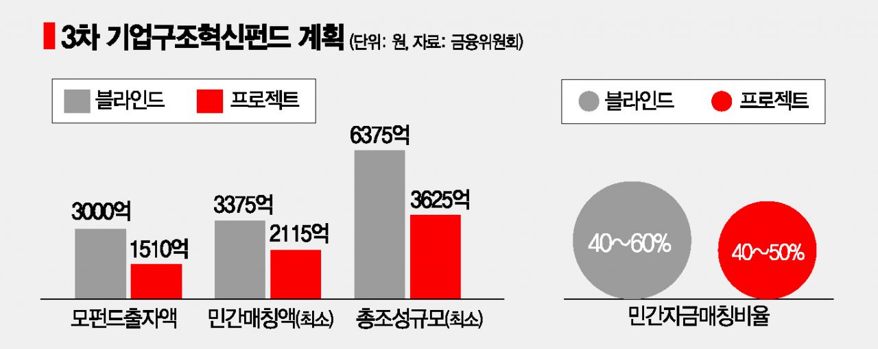 3차 기업구조혁신펀드는 정부재정 675억원을 바탕으로 KDB산업은행·수출입은행·IBK기업은행·자산관리공사(캠코) 등 정책금융기관 및 민간 은행·증권사 등이 출자해 모펀드 4510억원을 조성하면, 민간투자 약 5500억원 이상이 더해져 총 1조원 이상 규모로 만들어진다. 1조원 가운데 투자대상을 먼저 정하고 자금을 모아 투자하는 방식의 프로젝트펀드는 최소 3625억원, 자금을 먼저 모으고 이후 투자처를 찾아 투자하는 방식의 블라인드펀드는 최소 6375억원 규모다.