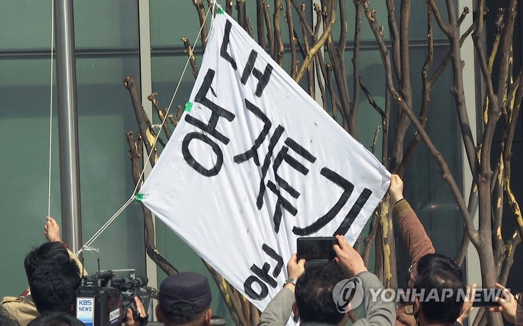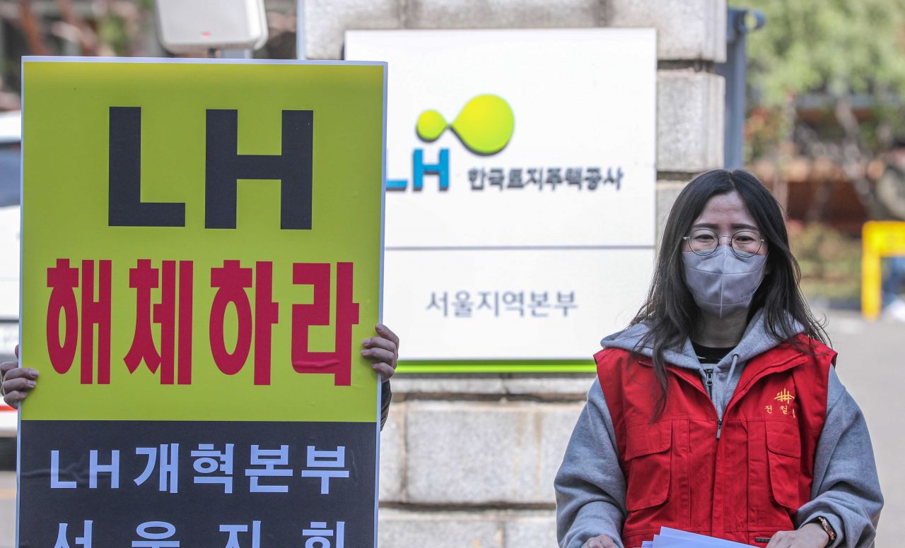 5일 서울 강남구 LH공사서울지역본부 앞에서 전국철거민협의회 소속 관계자들이 LH해체와 주택청 신설 및 서민주거안정을 촉구하는 기자회견을 하고 있다./강진형 기자aymsdream@