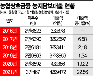 연도별로 살펴봐도 추이는 비슷하다. 농협은행의 농지담보대출 증가율은 2016년 17.1%, 2017년 17.28%, 2018년 12.48%로 두자릿수였지만 2019년 7.47%, 2020년 7.71%로 감소했다. 반면 농협상호금융은 2018(7.82%)·2019년(1.58%) 한자릿수에 머물던 대출액 증가율이 2020년 19.24%로 늘어났다.