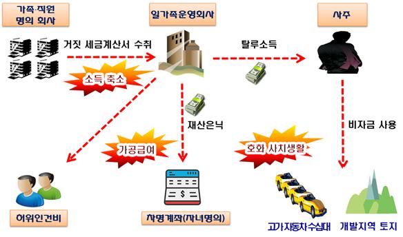 [세종=아시아경제 김현정 기자] A씨는 운영하는 회사의 매출이 급증하자, 세무전문가에게 조력을 받아 일가족 명의로 구매·생산·판매 업체를 각각 설립해 조직적으로 소득금액을 탈루하기 시작했다. 세 부담이 늘 때마다 위장업체를 설립했고, 자녀 명의의 차명계좌에 돈을 숨겼다. 가족 간 거짓거래를 만들거나 허위 인건비 계상으로 소득을 빼돌리기도 했다. 그렇게 탈루한 돈으로 신도시 개발지역 등 수백억원에 달하는 부동산을 집중 매수하고, 수십대의 고가 자동차나 비싼 회원권을 사는 등 호화·사치 생활을 영위했다.