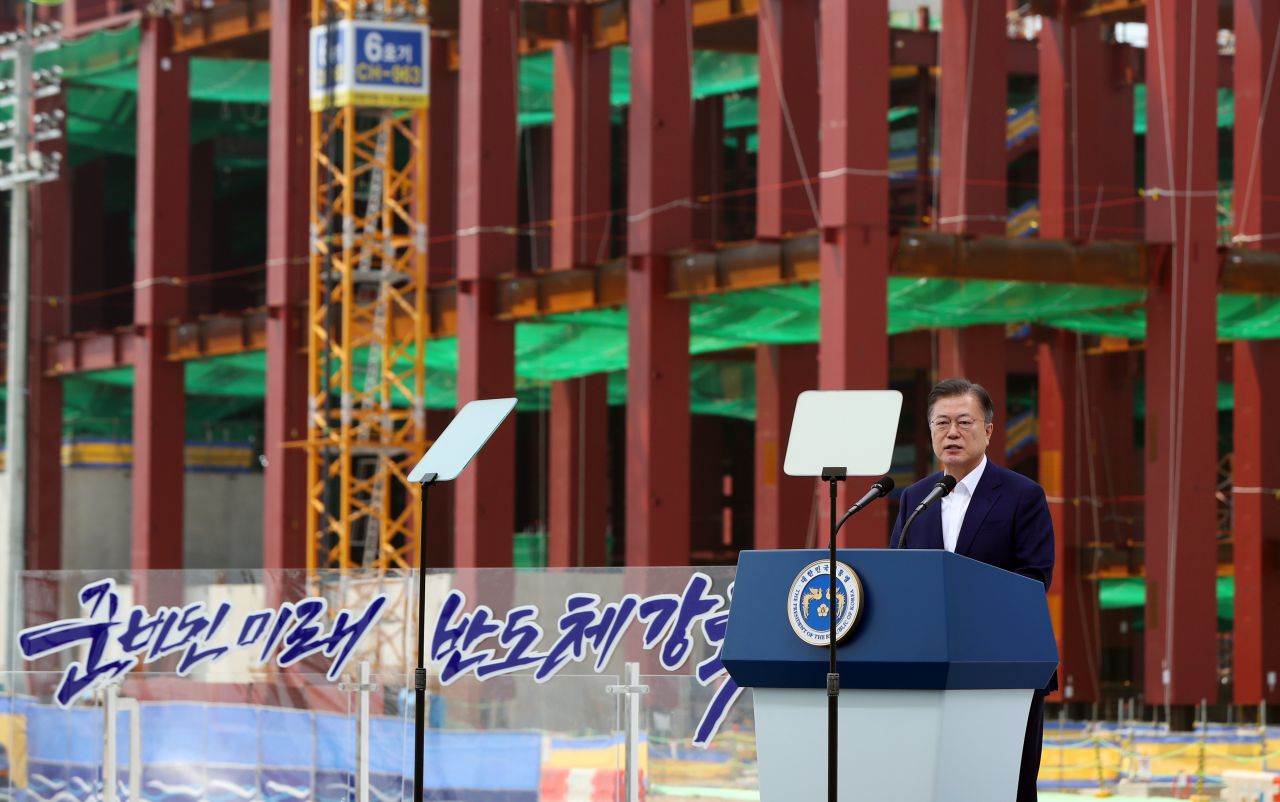 문재인 대통령이 13일 오후 경기도 평택시 삼성전자 평택단지 3라인 건설현장에 마련된 야외무대에서 열린 'K-반도체 전략 보고'에서 발언하고 있다.[이미지출처=연합뉴스]