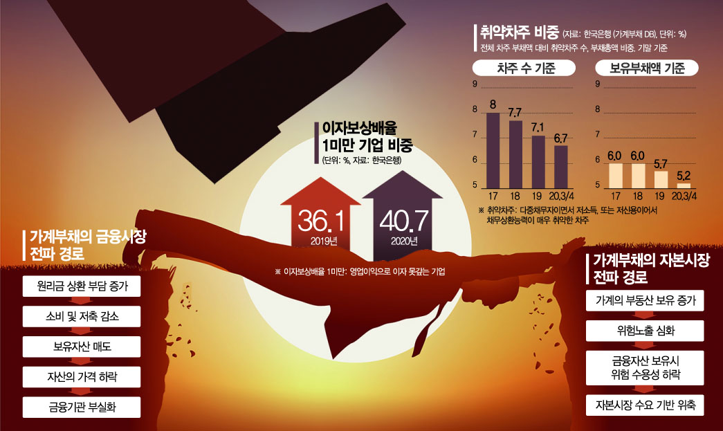 하지만 금리 인상 시 취약차주 부담을 무시할 순 없다. 전체 부채 규모 증가 속도가 빠를수록 취약계층 비중은 상대적으로 줄어들 수밖에 없기 때문이다. 한 한은 관계자는 "가계부채가 금융시스템 전체를 망가뜨릴 가능성이 크진 않지만, 금리를 올렸을 때 이미 코로나19 충격이 컸던 계층이 더 부담을 느끼게 된다는 점이 문제"라며 "지금도 K자 형태 회복이 나타난다고 하는데, 금리가 올랐을 때 이런 현상은 더 뚜렷해질 수 있다"고 말했다.