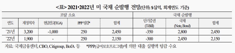 주혜원·김윤경 연구원은 "코로나19 백신 접종 및 경기회복이 진행됨에 따라 정부 지출이 감소할 전망이며, 인프라 법안의 재정적자 확대 효과 역시 수년에 걸쳐 분산될 것임을 고려하면 국채 공급 부담이 완화될 것"이라고 전망했다.