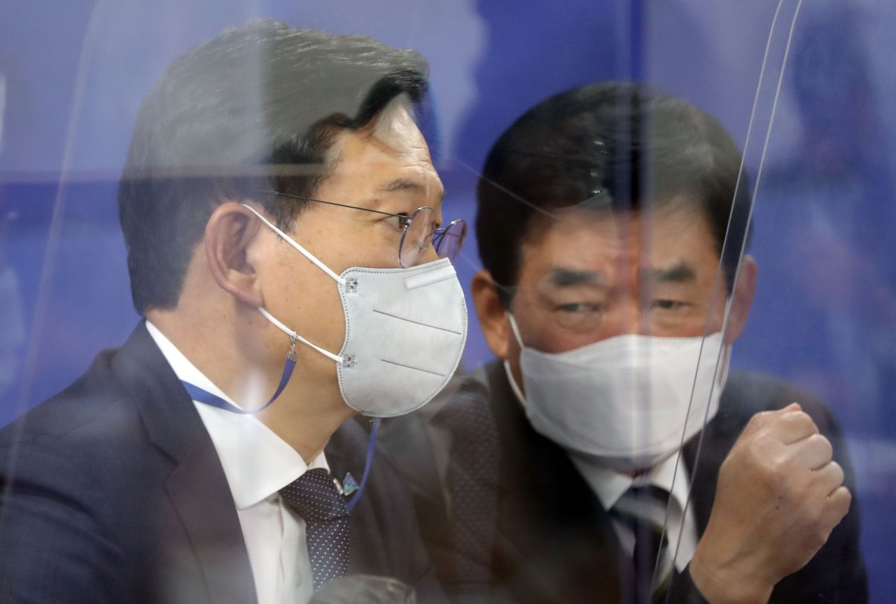 송영길 더불어민주당 대표와 김진표 부동산특별위원회 위원장이 12일 국회 의원회관에서 열린 부동산특별위원회 회의에 참석, 회의 도중 이야기를 나누고 있다./윤동주 기자 doso7@