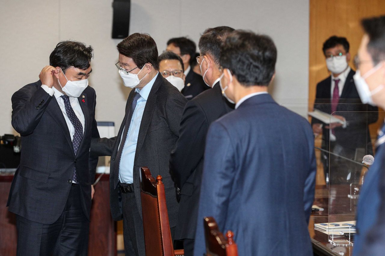 윤관석 더불어민주당 의원과 정희수 생명보험협회 회장이 22일 서울 중구 은행연합회관에서 열린 '더불어민주당-금융권CEO, K뉴딜 지원방안 회의'에 참석해 의견을 나누고 있다./강진형 기자aymsdream@