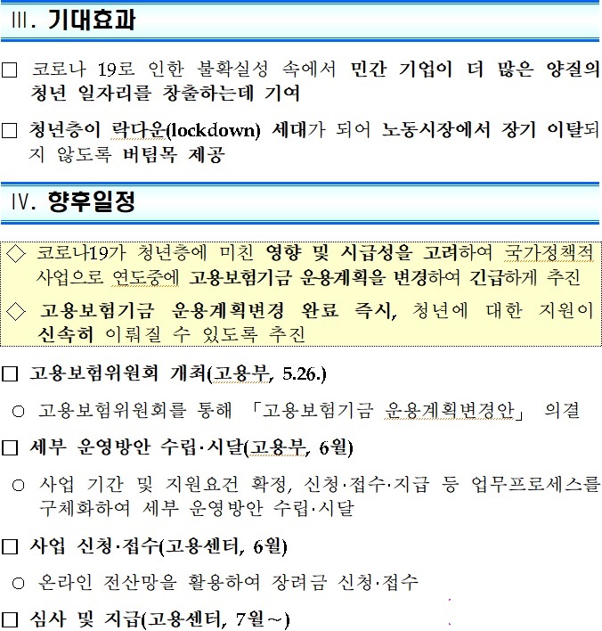 고용부는 다음달까지 고보기금 재정 세부 운영방안을 세운 뒤 오는 7월부터 고용센터를 활용해 신청 접수를 받기로 했다. 고용부 관계자는 "코로나19가 청년층에 미친 영향 및 시급성을 고려해 국가정책적 사업으로 올해 중 고보기금 운용계획을 변경해 긴급하게 정책을 추진할 것"이라며 "고보기금 운용계획변경이 끝나는 즉시 청년 지원이 신속히 이뤄질 수 있도록 추진할 것"이라고 말했다.