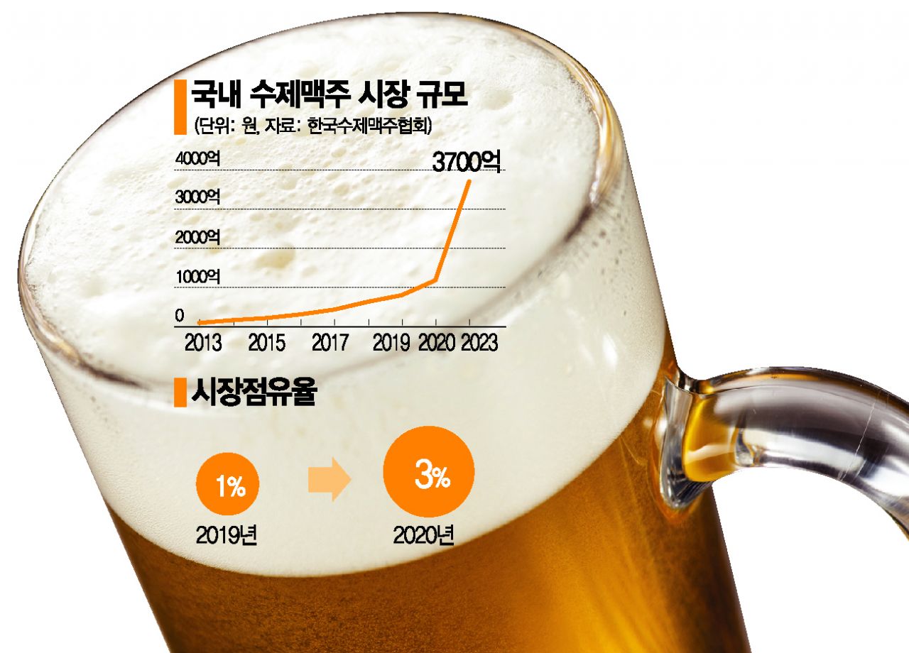 수제맥주 시장 연평균 40% 성장18일 맥주업계에 따르면 지난해 1180억원 규모였던 국내 수제맥주시장 규모는 오는 2023년 3700억원으로 3배 이상 성장할 것으로 전망됐다. 국내 맥주시장 전체 성장률은 10년간 연평균 0.3% 수준으로 정체돼 있는 가운데 수제맥주시장은 2017년부터 지난해까지 연평균 40%의 높은 성장세를 보이며 시장 점유율도 2019년 1%대에서 지난해 3%까지 뛰어올랐다.