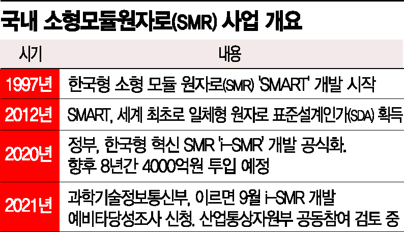 정부는 지난해 12월 국무총리 주재로 원자력진흥위원회를 열고 i-SMR 개발에 8년간 4000억원을 투자한다는 계획을 내놓은 바 있다. 한국이 독자기술로 개발해 2012년 세계 최초로 일체형 원자로 표준설계인가(SDA)를 획득한 'SMART'의 차세대 모델 개발 사업이다. i-SMR 연구개발(R&D)은 과기부 소관이지만 원전 주무부처인 산업부가 개발 초기 단계부터 참여하는 것이다.