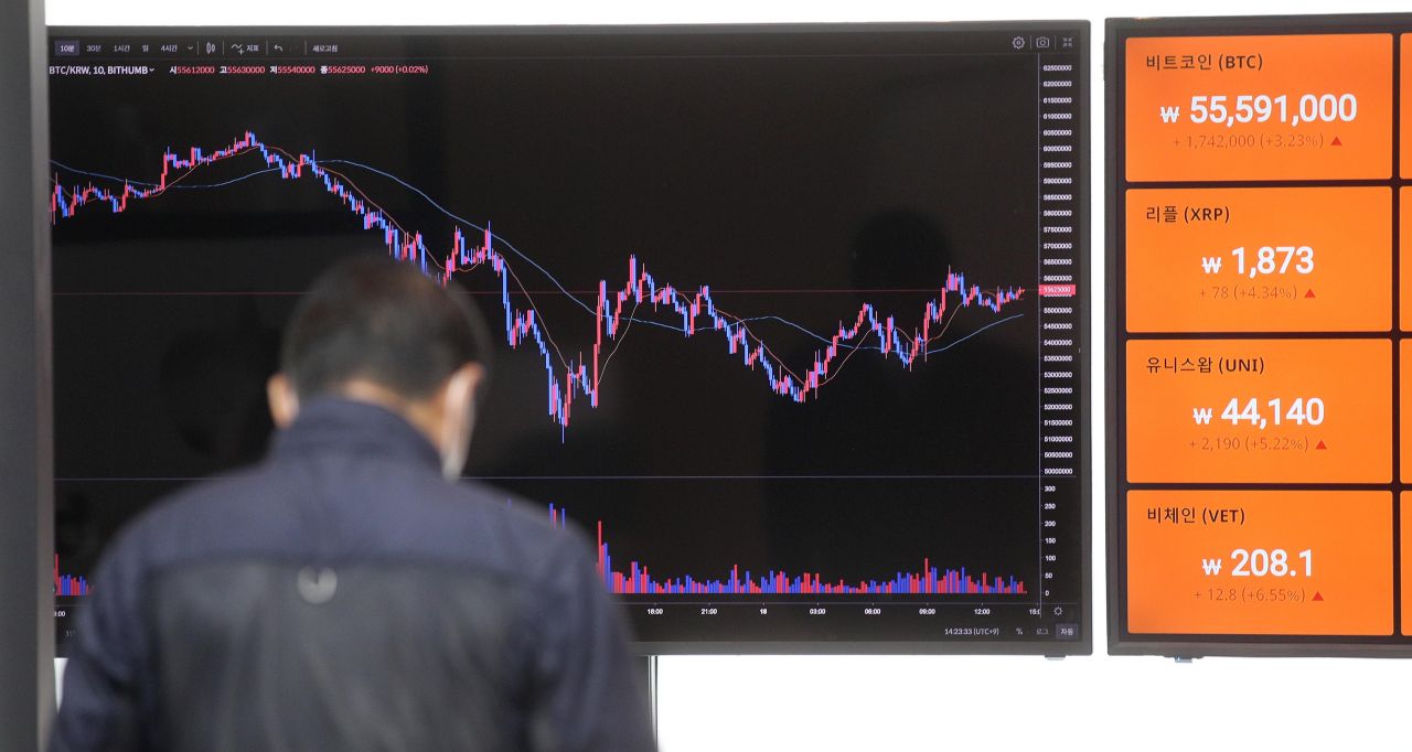 전날 5100만원대까지 떨어졌던 대표 가상화폐(암호화폐) 비트코인이 5500만원대로 반등했다. 비트코인이 환경을 해친다는 일론 머스크 테슬라 최고경영자(CEO)의 주장을 낙관론자들이 정면 반박했다. 국내 가상화폐 거래소 관계자에 따르면 18일 오후 2시6분 기준 비트코인은 전날 대비 2.83% 상승한 5558만원을 기록했다. 지난 14일부터 4거래일 연속 떨어지며 7000만원대에서 전날 5138만원까지 하락했지만 반등했다. 사진은 이날 빗썸 강남센터 모습./김현민 기자 kimhyun81@