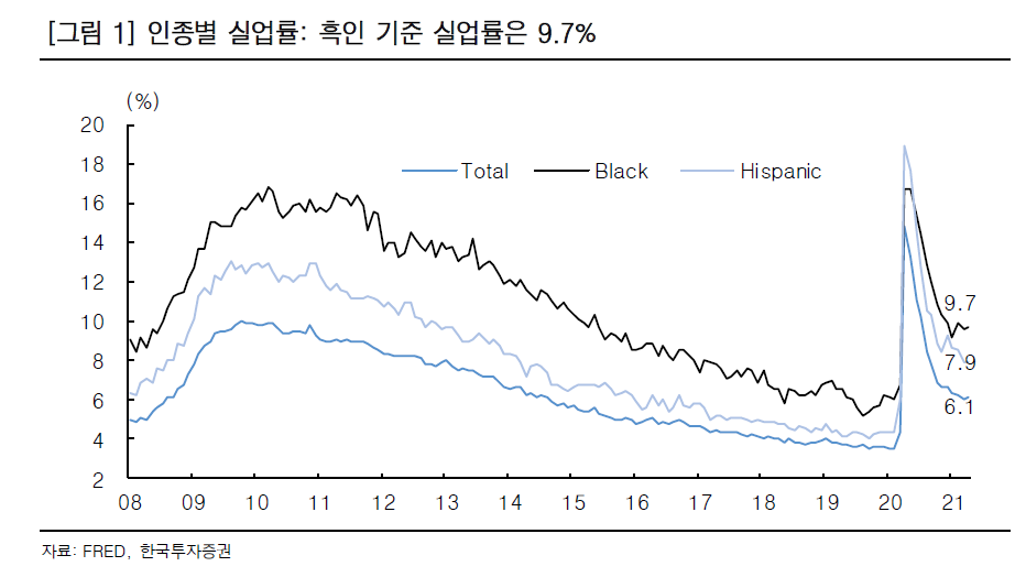 여기에 최근 인종별 불평등 해소를 위해서는 일반 실업률이 아닌 각 인종별 실업률에 집중해야 한다는 주장도 제기되고 있다. 이는 매우 비둘기적인 생각이라는 분석이다. 흑인과 히스패닉 계열의 실업률은 전체 실업률을 꾸준히 상회하는 흐름을 보였다. 최근 발표된 지난 4월 고용지표에서도 미국 전체 실업률은 6.1%인 반면 흑인 실업률은 9.7%, 히스패닉은 7.9%를 기록했다. 통화정책 결정에 6.1% 대신 9.7%를 고려한다면 통화 긴축 시점이 예상보다 멀어질 수 있는 셈이다.