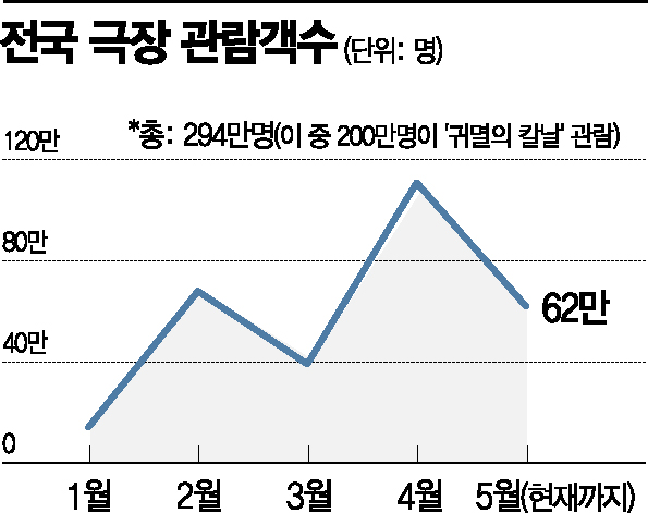 ◆ 극장·서점 점령한 ‘귀멸의 칼날’ = 21일 영화진흥위원회에 따르면 1~5월 현재까지 국내 극장 관객 수는 294만명에 달하는 것으로 나타났다. 이 중 70%의 관객이 일본 애니메이션 ‘귀멸의 칼날: 무한열차편’을 관람했다. 누적 관객 수 200만명을 넘어선 뒤에도 여전히 순항 중이다. 코로나19로 극장가가 침체기인 상황에서 귀멸의 칼날이 흥행에 성공하자 "일본 불매운동은 끝났다"는 얘기까지 나온다. 배경 자체가 일본 개화 이후의 다이쇼 시대이고 주인공들은 모두 일본 사무라이들이다. 주인공의 귀걸이는 화투패를 바탕으로 디자인됐는데 욱일기를 연상시켜 ‘우익’ 논란에 휩싸이기도 했다. 내용상 사지 절단을 비롯한 잔인한 장면이 많아 애니메이션이지만 15세 관람가로 정해졌다. 서점가에서도 ‘귀멸의 칼날’ 열풍이 이어진다. 지난달 이후 줄곧 상위권을 유지하고 있다. 교보문고가 발표한 온·오프라인 종합 베스트셀러 집계 순위에 따르면 귀멸의 칼날23은 출간 이후 4주 연속 종합 1위에 올랐다.