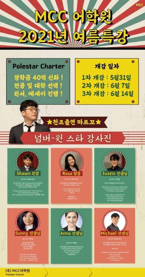 MCC어학원 션 원장은 “MCC는 학생들을 최우선에 두는 학원이다. 학생들과 긴밀히 호흡하고 챙기면서 멘토로서의 역할을 자임한다”며 “수 년간 검증된 MCC의 시스템을 통해 SAT 준비는 물론 대입에 필요한 상담과 준비까지 받을 수 있는 one-stop 어학원”이라고 말했다.
