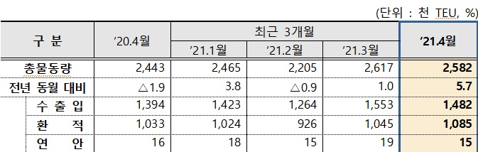 [세종=아시아경제 문채석 기자] 지난달 전국 항만이 처리한 컨테이너 물동량이 한 해 전 4월보다 5.7% 늘어난 것으로 나타났다. 정부는 컨테이너 운임 상승, 물류 적체, 선복 부족 등에 대비하겠다고 말했다.