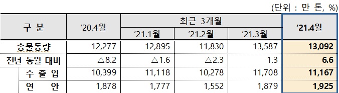 지난달 전국 무역항에서 처리한 항만 물동량은 1억3092만t으로 지난해 같은 기간의 1억2277만t)보다 6.6% 증가했다. 수출입 물동량은 7.4% 늘어난 1억1167만t, 연안 물동량은 2.5% 증가한 1925만t이 처리됐다. 박 과장은 "코로나19로 인한 경제 불확실성도 남아 있지만 백신 보급 확대와 주요국의 적극적인 경기부양책으로 수출입 물동량이 늘고 있다"고 했다.