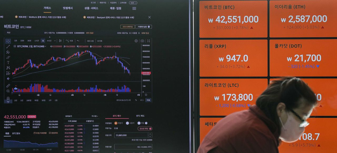 비트코인이 4천만원대로 급락한 24일 서울 강남구 빗썸 전광판에 코인 시세가 표시되고 있다./강진형 기자aymsdream@