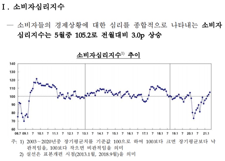 CCSI는 소비자동향지수(CSI)중 6개 주요지수를 이용해 산출한 심리지표로, 장기평균치(2003년 1월~2020년 12월)를 기준값 100으로 해 100보다 크면 장기평균보다 낙관적임을, 100보다 작으면 비관적임을 의미한다. 지난해 겨울 코로나19 재확산세가 이어지자 하락하던 CCSI는 올해 1월부터 5개월째 상승세를 이어가고 있다. 이미 CCSI는 3월부터 100을 넘어 '낙관' 추세를 이어가고 있었다.