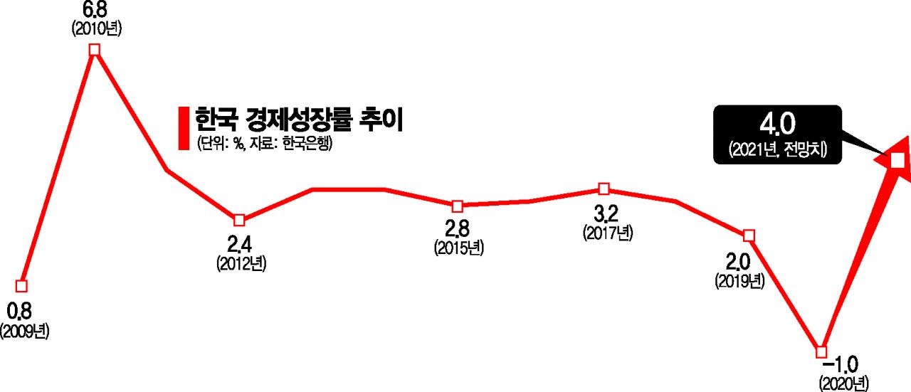 이날 한은은 올해 경제성장률 전망치를 3.0%에서 4.0%로 석 달 만에 1.0%포인트나 상향 조정했다. 올해 물가상승률 전망치도 1.3%에서 1.8%로 높였다. 국내경제 회복세가 수출과 투자호조, 민간소비 개선 등에 힘입어 강화될 것으로 본 것이다.