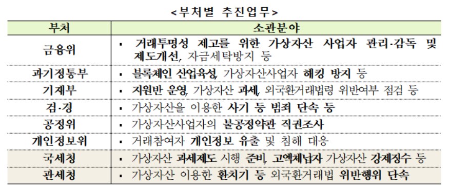 28일 정부가 발표한 '가상자산 거래 관리방안'에 따르면 금융위가 거래 투명성 제고를 위한 사업자 관리·감독 및 제도개선 작업을 주도하기로 하고, 관련 기구와 인력을 보강하기로 했다. 블록체인 기술발전·산업육성은 과학기술정보통신부가 맡는다.