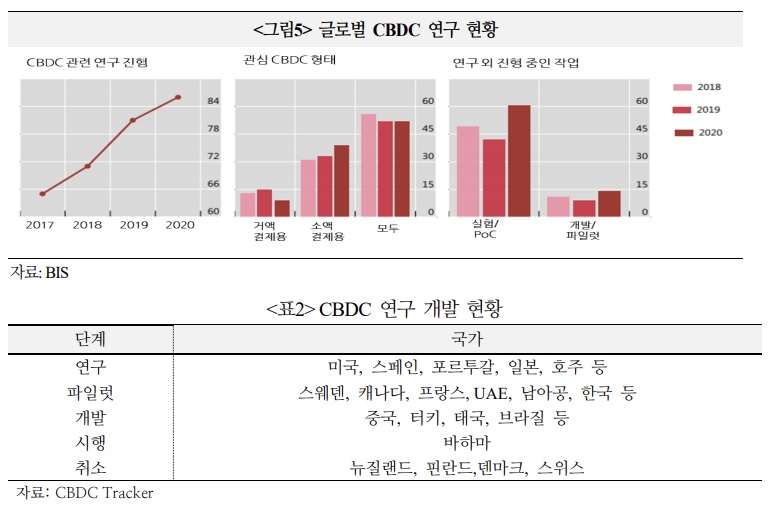 그러면서도 "다만 기술, 금융, 경제 체제에 미치는 파급력이 커 각국 중앙은행들이 신중하게 접근 중인 만큼 단기에 상용화할 여지는 매우 제한적"이라며 "CBDC는 화폐, 중앙은행, 금융기관 등의 역할·개념에 대한 재정립을 시사하므로 신중한 접근이 필요하다"고 덧붙였다.