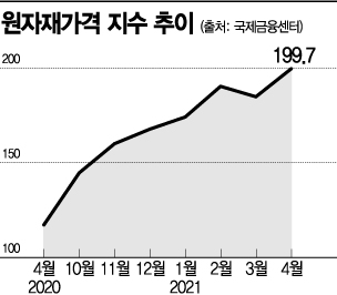 1일 국제금융센터에 따르면 국제 원자재 가격지수인 CRB지수는 지난 4월 199.7로, 1년 전(117.2)보다 70.4% 급등한 것으로 나타났다. CRB지수는 곡물, 원유, 귀금속 등 19개 상품선물로 구성돼 있다. 특정 품목이 아닌 상품 전반에 걸쳐 강세가 나타난 결과다.