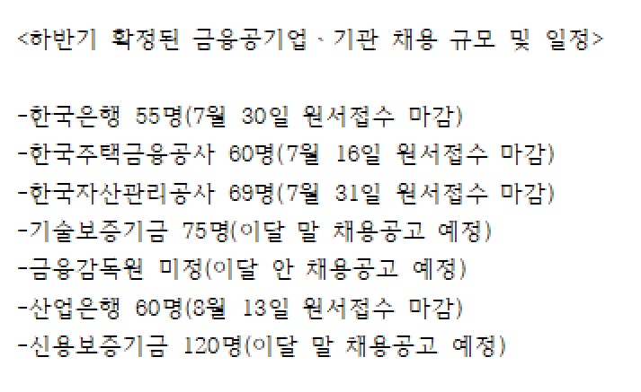 금감원, 한국은행, KDB산업은행, 한국수출입은행 등은 지난달 이미 서류 접수를 마감했거나 이달 안에 공채 절차를 시작해 다음달 필기시험을 치르는 방향으로 채용 일정 가닥을 잡았다. 금감원은 아직 공채 공고를 내지는 않았지만 지난해와 비슷한 규모로 신입직원을 선발하며 한은, 산은, 수은 등과 함께 다음달 12일에 필기시험을 치를 것으로 예상되고 있다. 늦어도 11월까지 면접 일정을 마무리 지으면 12월 안에 합격자가 결정될 수 있다. 금융공기업들이 하반기 채용일정을 예년보다 한달 정도 앞당기면서 합격자 발표도 당겨지게 됐다.