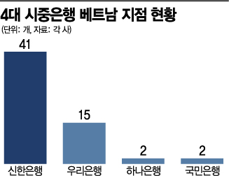 1일 금융권에 따르면 국민·신한·하나·우리 등 4대 시중은행의 베트남 점포(현지법인 지점 포함)는 총 60개에 달한다. 신한은행은 현지법인 신한베트남은행을 통해 전국에 41개의 점포를 보유 중이고 우리은행 현지법인 우리베트남은행은 지점 15개, 국민은행과 하나은행은 각각 지점을 2개씩 운영하고 있다.