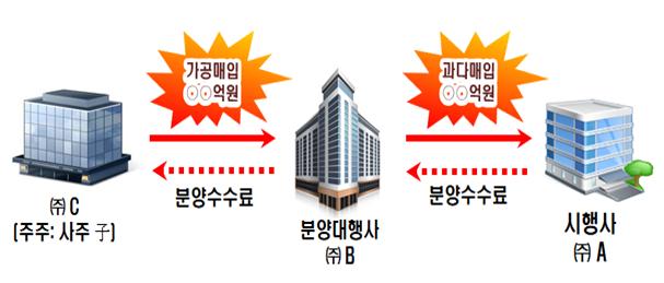 [세종=아시아경제 김현정 기자] 신규택지 개발지역에서 부동산 개발사업을 하는 시행사 A는 거래처 B에게 과다한 분양대행 수수료를 지급했다. 알고보니 B는 A 사주의 미성년 자녀가 100% 지분을 보유한 C로부터 용역을 받은것으로 꾸며 허위로 분양대행수수료 수십억원을 지급해 법인자금을 유출했다. A사 등은 법인세 등 수십억원을 추징받게 될 예정이다.