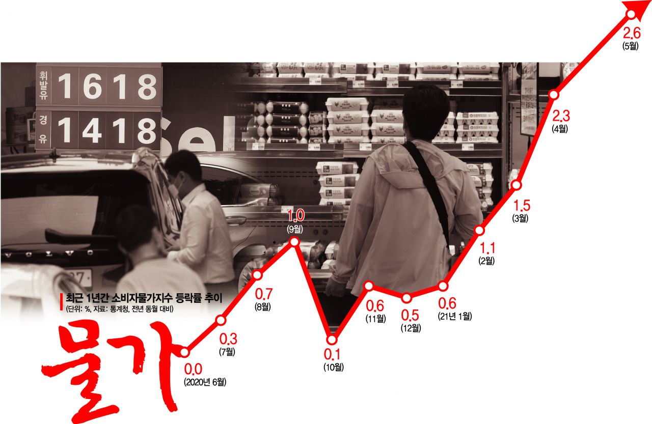 2일 통계청이 발표한 ‘5월 소비자물가동향’에 따르면 지난달 소비자물가지수는 전년 동월 대비 2.6% 오른 107.46(2015년=100)을 나타냈다. 지난해 5월 소비자물가가 마이너스를 기록한 데 따른 기저효과와 함께 경기회복으로 상품 수요가 증가한 영향이 컸다. 4월에도 2%를 웃돈 만큼 2분기 전체 물가상승률은 정부의 연간 물가관리 목표치인 2%를 크게 상회할 가능성이 커졌다.
