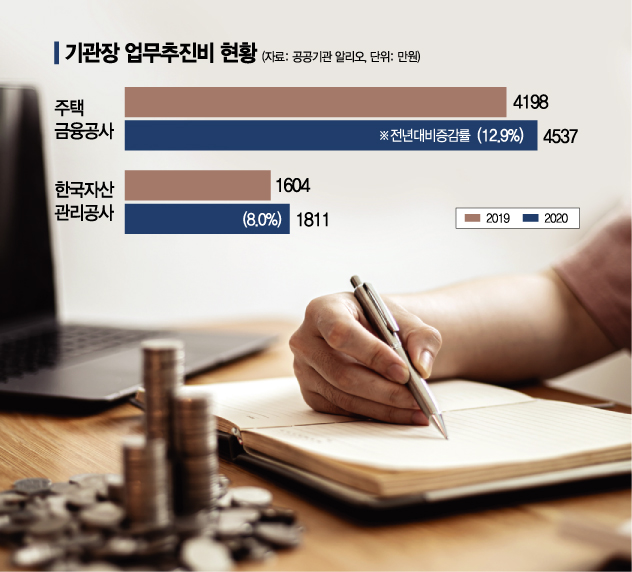 공기업들은 대체로 기관장 업추비를 줄이는 추세다. 세부 사용처를 알기 어려워 기관장의 쌈짓돈으로 유용될 수 있다는 지적이 많았기 때문이다. 시장형 공기업의 사장들은 2017년 평균 1023만원에 육박하던 업추비를 3년간 784만원으로 239만원 줄였다. 준시장형 공기업도 868만원에서 696만원으로 줄어들었다.