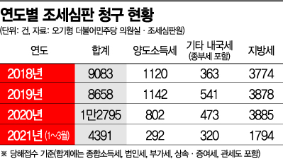 조세심판청구에서 가장 눈에 띄는 것은 종합부동산세 등 부동산 관련 사안이 늘었다는 점이다. 올 1분기에만 216건이 접수돼 지난해 전체 숫자(168건)을 넘어섰다. 부동산 과세에 대한 불만이 크다는 뜻이다.