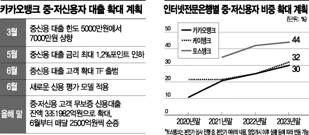 앞서 금융위원회는 지난달 27일 ‘인터넷전문은행 중·저신용자 대출 확대계획’을 발표하고 카카오뱅크, 케이뱅크, 토스뱅크 등 인터넷은행의 중·저신용자 대상 신용대출 비중을 2023년말 30% 이상으로 끌어올릴 것이라고 밝혔다. 중·저신용자는 신용등급 4등급 이하로, 신용평점 하위 50% 차주가 대상이다.