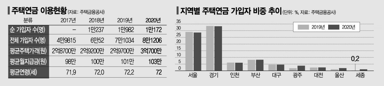 가입자 증가세는 문재인 정부 들어 집값이 크게 뛰었던 서울과 경기지역을 위주로 뒷걸음질했다. 두 지역의 지난해 말 주택연금 가입자는 각각 2만3223명, 2만7037명이다. 전체에서 28.6%, 33.3%를 차지한다. 2017년 30.7%(1만5292명), 34.3%(1만7092명)에서 매년 감소했다. 평균 월지급금이 각 139만원, 107만원에 달해 가장 높지만 비중은 오히려 낮아진 셈이다.