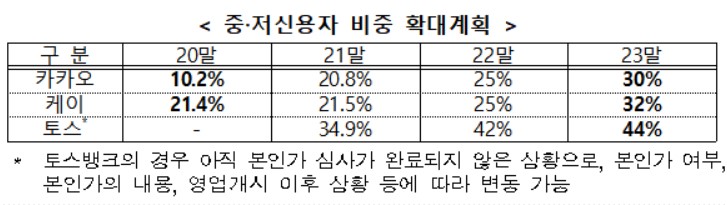 케이뱅크와 카카오뱅크가 2023년 말까지 목표로 정한 중·저신용자 비중은 각각 32%, 30%인데 반해 토스뱅크는 영업 첫 해 부터 30% 이상으로 설정, 2023년에는 44% 수준까지 끌어올린다는 계획이다. 토스 관계자는 "금융당국이 중·저신용자 대상 신용대출 비중 확대를 꾀하고 있어 토스의 앞선 신용평가 능력이 긍정적 평가를 받는데 역할을 할 것"이라고 했다.