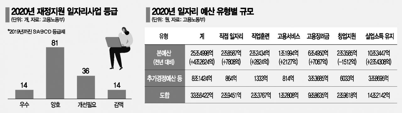 고용부가 국무회의에서 보고한 '재정지원 일자리사업 효율화 방안'에 따르면 직접 일자리 외 직업훈련, 고용서비스, 고용장려금, 창업지원, 실업소득 유지 등 6개 항목을 모두 포함한 전체 재정 일자리 사업 평가 결과도 좋지 않았다. 지난해 정부가 진행한 145개의 내역사업 중 '우수' 등급은 14개로 전체의 9.7%에 불과했다. '양호'는 81개, '개선 필요'는 36개, '감액'은 14개였다. '감액' 사업으로 평가받으면 내년도 예산 삭감 내지는 사업 폐지까지 갈 수 있다. 고용부는 다만 등급별 구체적인 사업 내역은 공개하지 않았다. 고용부 관계자는 "올 연말 사업별 등급 대국민 공개를 추진 중"이라고 말했다.