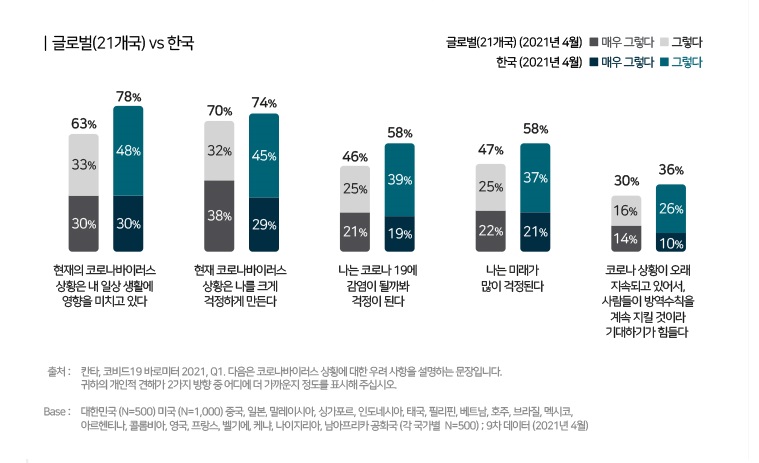 한국은 코로나19 상황에 대한 우려 수준을 평가하는 모든 항목에서 글로벌 평균 대비 부정적 응답률이 높았다. 현재의 코로나19 상황은 내 일상생활에 영향을 미치고 있다(글로벌 63%·한국 78%), 코로나19에 감염될까봐 걱정된다(글로벌 46%·한국 58%), 미래가 많이 걱정된다(글로벌 47%·한국 58%) 등 3개 항목에서 글로벌 대비 10%포인트 이상 높았다. 한국인의 우려 수준이 높은 것은 낮은 백신접종률과 상관관계가 있는 것으로 분석된다.