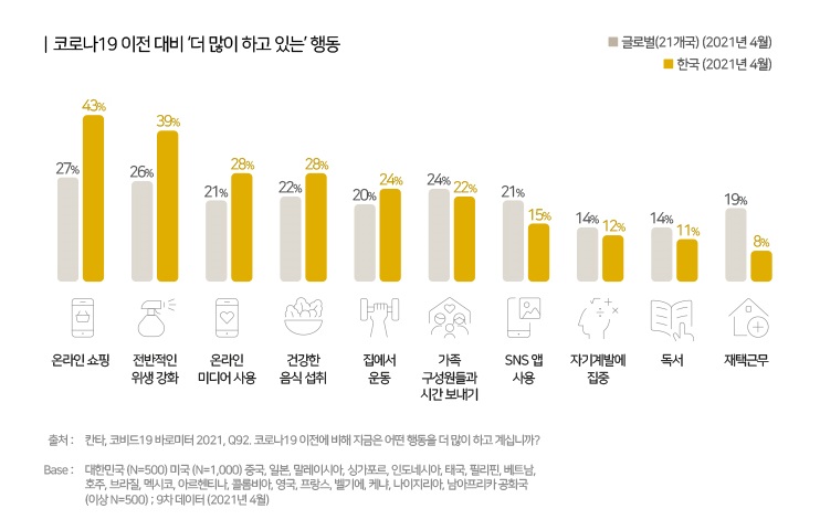 한국 소비자는 코로나19 이전에 비해 온라인 쇼핑과 미디어 사용, 위생에 대한 인식과 행동 등이 강화됐다. 특히 온라인 쇼핑 증가율은 43%로 글로벌 대비 16%포인트 높았다. 또한 제품 가격, 위생 등에 대한 민감도가 상승한 것으로 나타났다. 지난해 데이터와 비교하면 제품 가격에 주의를 더 기울인다는 49%에서 64% 증가했고, 살균 제품을 더 많이 구입한다는 40%에서 47%로 늘었다.
