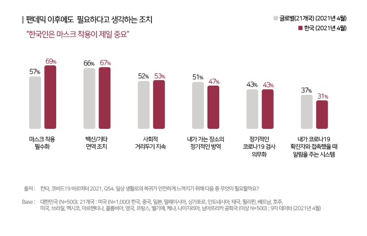 한국인은 팬데믹 종료 이후에도 마스크 착용이 중요하다고 응답했다. 일상생활로의 복귀가 안전하게 느껴지기 위해서 어떤 조치가 필요한가를 묻자 마스크 착용 필수화(69%), 백신 접종(67%), 사회적 거리두기 지속(53%), 내가 가는 장소의 정기적 방역(47%), 정기적 코로나19 검사 의무화(43%) 등 순으로 답했다. 마스크 착용 필수화에 대한 글로벌 동의율은 57%로, 한국보다 12% 포인트 낮았다.
