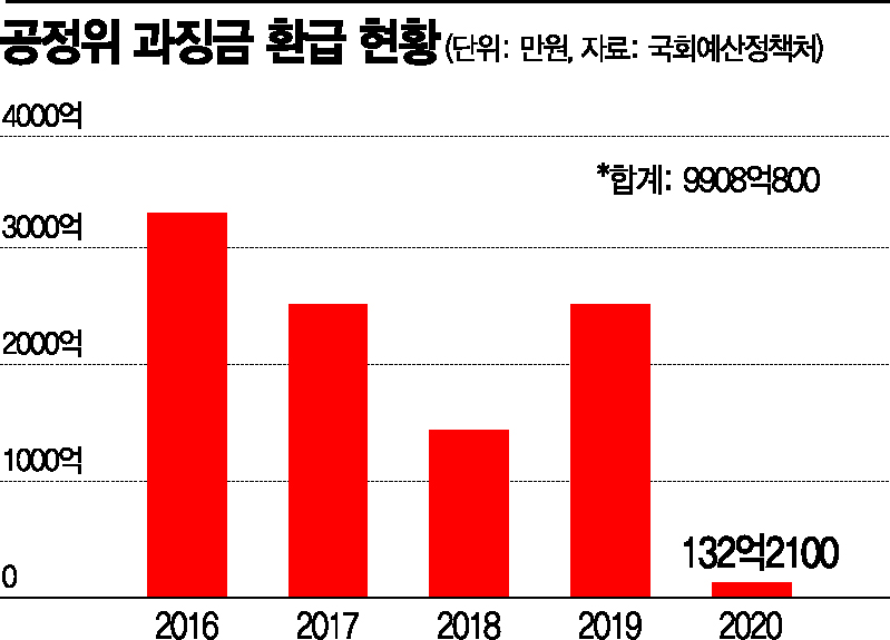 8일 국회예산정책처에 따르면 공정위는 2016~2020년 행정소송 패소 등에 따라 과징금 9908억원을 환급했다. 같은 기간 과징금 수납액(2조459억원, 퀄컴 과징금 제외분)의 48%를 기업에 다시 돌려준 것이다. 공정위는 사업자가 제기한 소송에서 확정적으로 패소하거나 직권으로 과징금 처분 취소 사유가 발생하면 수납한 과징금을 환급한다.