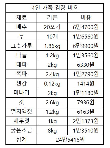 8일 기준 4인 가족 김장 비용