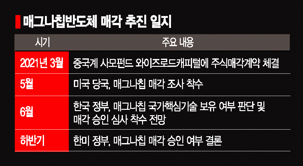 업계 관계자는 "산업부가 OLED용 DDI 관련 기술을 국가핵심기술로 지정한 건 미국이 매그나칩 매각을 불허할 가능성을 염두에 둔 포석"이라며 "일단 국가핵심기술로 지정해 놓으면 M&A를 승인할지, 말지 결정할 수 있는 만큼 향후 미국의 기류를 봐가면서 정부도 입장을 정하지 않겠느냐"고 했다.