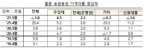 금융위원회가 10일 발표한 '5월 가계대출 동향'에 따르면 지난달 전 금융권 가계대출은 1조8000억원 줄었다. 지난 4월 증가액이 25조4000억원에 달했다는 점을 감안하면 눈에 띄게 감소한 것이다. 월 기준 가계대출 잔액이 줄어든 것은 2014년 1월(-2조2000억원) 이후 7년 4개월 만이다.