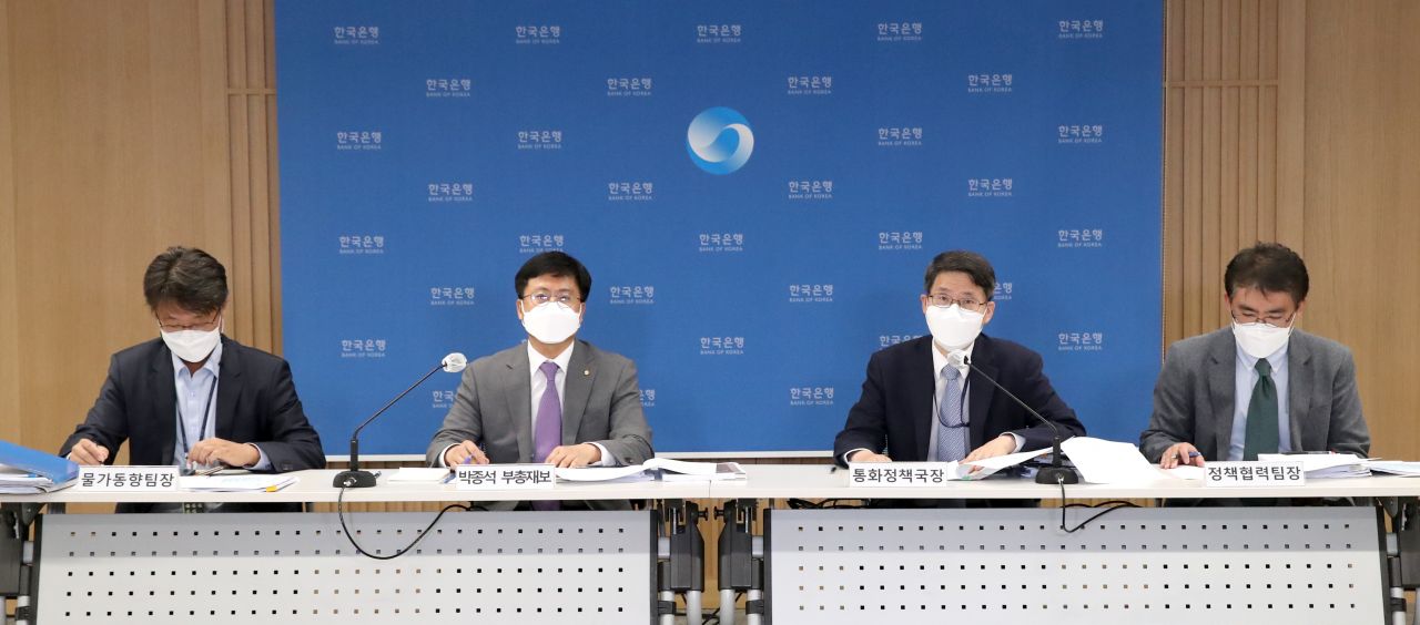 10일 오전 서울 중구 한국은행에서 열린 통화신용정책보고서(2021년 6월) 설명회. 사진 왼쪽부터 이정익 물가동향팀장, 박종석 부총재보, 이상형 통화정책국장, 봉관수 정책협력팀장