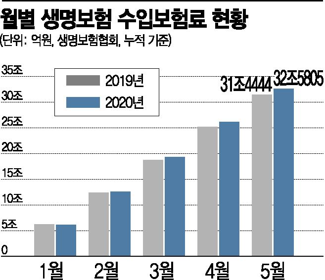 5일 생명보험협회 통계에 따르면 올들어 1~5월 국내 생명보험사의 누적 보험료 수입은 32조5805억원을 기록했다. 지난해 같은 기간 31조4444억원 보다 3.5% 증가한 규모다.