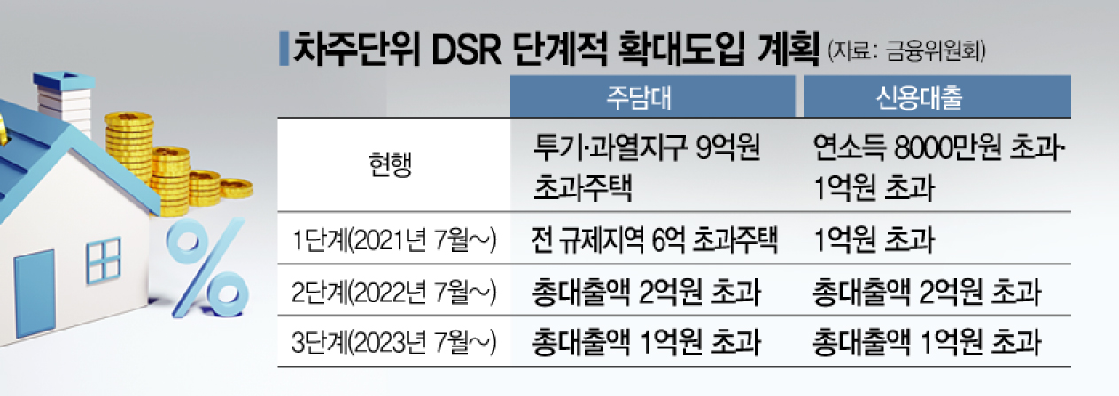 대책에 따라 오는 7월부터 개인별 DSR 40% 적용 대상이 전체 규제지역(투기지역·투기과열지구·조정대상지역)의 시가 6억원 초과 주택으로 확대된다.