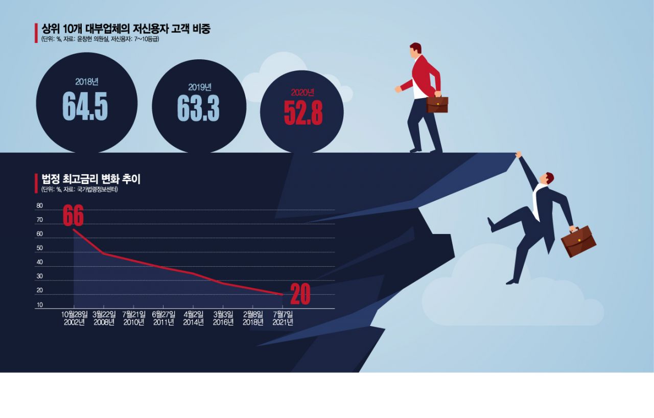 최고금리 인하로 인한 후유증은 10년 전 같은 조치를 단행한 일본의 선례에도 나타나고 있다. 일본은 2010년 6월부터 출자법상 최고금리를 연 29.2%에서 연 20%로 가파르게 내렸다. 여신금융연구소의 ‘일본 대금업 규제 강화 이후 10년간의 시장 변화’ 보고서에 따르면 지난해 3월 등록 대금업체는 1647곳으로 2009년 3월보다 73.3% 급감했다. 일본금융청은 2010년부터 불법대금업 이용경험자가 7배 이상 늘어난 것으로 보고 있다.