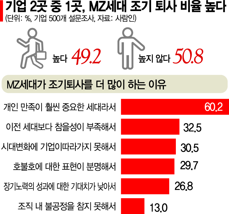 사람인 조사에 따르면 MZ세대 조기퇴사 원인 중 최우선은 ‘개인의 만족이 훨씬 중요해서’(60.2%·복수응답)였다. 인사 담당자들이 생각하는 직원들의 퇴사 사유는 ‘직무적성이 안 맞아서’(48%·복수응답)가 가장 컸다. 다음으로 ‘조직문화 불만족’(31.1%), ‘급여 및 복리후생 불만’(28.2%), ‘높은 근무강도’(20.4%), ‘낮은 연봉’(19.6%) 등이 이어졌다. 업무가 본인과 맞지 않고, 회사가 경력관리를 해 주지 않는다고 판단되면 시간을 허비하며 버티지 않겠다는 것이다.