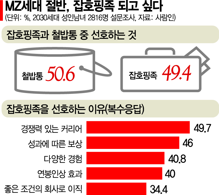 지난해 사람인 설문조사 결과에서 2030 세대에서 ‘잡호핑족(일자리를 옮겨다니는 것)’을 ‘철밥통’보다 선호한다는 이들이 절반에 달한 것도 이런 이유들이 배경이 됐다. 성인남녀 2816명을 대상으로 조사한 결과 49.4%가 잡호핑족을 선호했고, 본인이 잡호핑족이 될 것으로 생각하는 이들은 82.2%에 달했다. 잡호핑족을 선호하는 이유는 ‘경쟁력 있는 커리어를 만들고 싶어서’(49.7%·복수응답)가 가장 많았다.