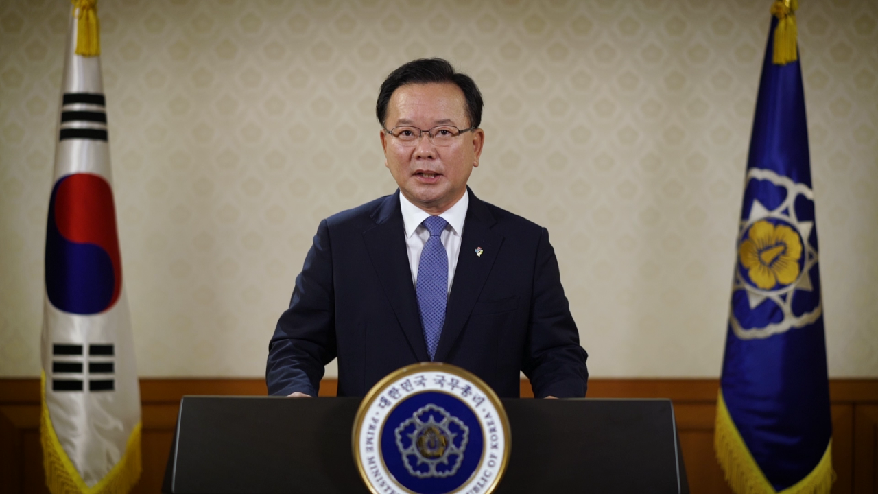 김부겸 국무총리가 15일 '2021 유엔 글로벌컴팩트(UNGC) 정상회의'에서 기조연설을 하고 있다. (사진=국무조정실)