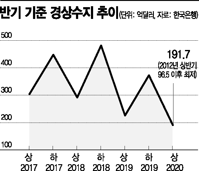 [아시아경제 김은별 기자] 올해 상반기 경상수지 흑자가 신종 코로나바이러스감염증(코로나19) 여파로 8년 만에 가장 적은 수준까지 줄었다. 다만 6월 경상수지는 개선세를 보여 코로나19로 인해 집중됐던 4~5월 충격은 다소 완화하는 모습을 보여줬다.